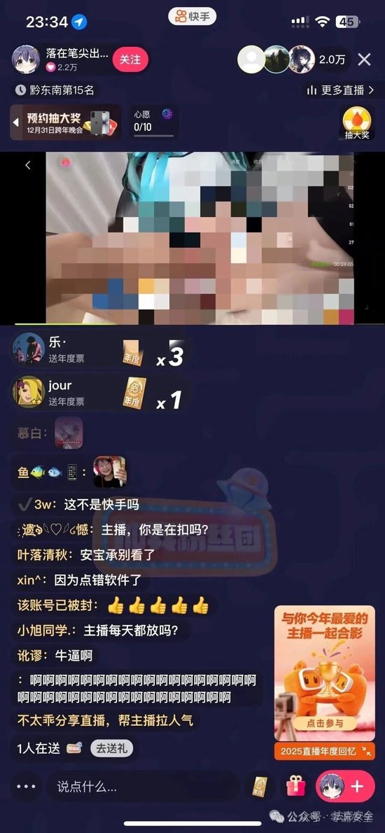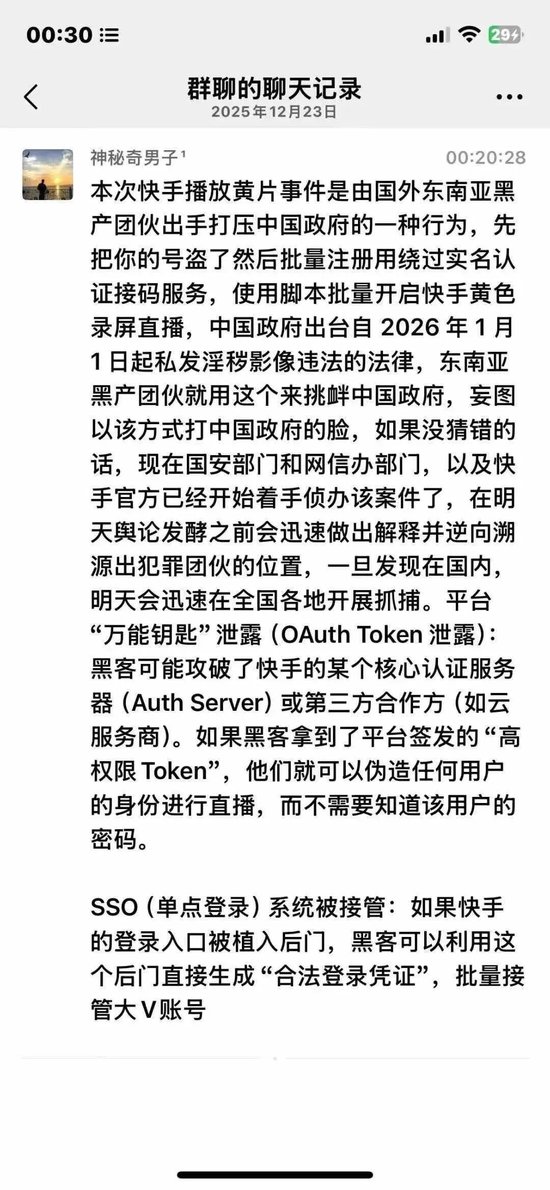 本次快手播放黄片事件是由国外东南亚黑产团伙出手打压中国政府的一种行为,先把你的号盗了然后批量注册用绕过实名认证接码服务,使用脚本批量开启快手黄色录屏直播,中国政府出台自2026年1月1日起私发淫秽影像违法的法律,东南亚黑产团伙就用这个来挑衅中国政府,妄图以该方式打中国政府的脸,如果没猜错的话,现在国安部门和网信办部门,以及快手官方已经开始着手侦办该案件了,在明天舆论发酵之前会迅速做出解释并逆向溯源出犯罪团伙的位置,一旦发现在国内,明天会迅速在全国各地开展抓捕。