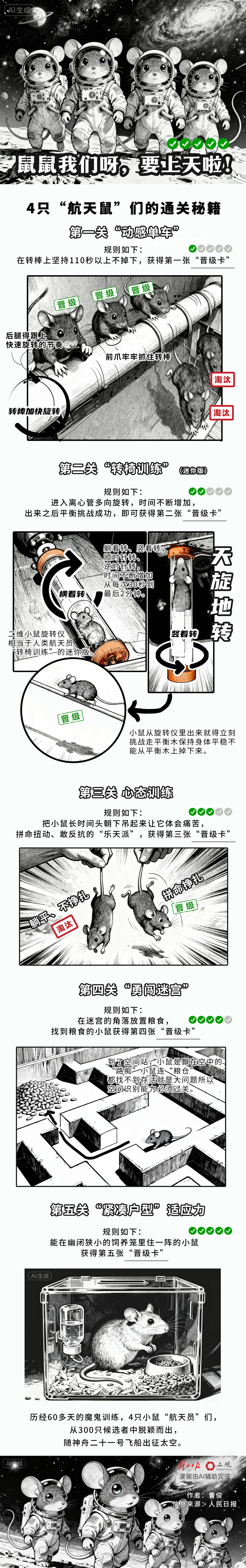 想知道太空旅行有多难?连小老鼠都得闯 5 关!4 只 “鼠鼠航天员” 从 300 只候选者中杀出重围,即将随神舟飞船奔赴太空。别以为它们只是运气好 —— 转棒上坚持 110 秒不掉队,离心旋转后还能走平衡木,倒吊时拼命挣扎不躺平,迷宫里精准找粮仓,狭小笼子里住得倍儿香…… 每一关都在模拟太空挑战:转棒练失重平衡,旋转仪防 “太空晕车”,倒吊磨心态,迷宫测空间感,小笼子模拟空间站生活。60 多天魔鬼训练,它们把 “求生欲” 拉满,终于拿到 “太空入场券”。接下来,就跟着这组漫画,看看鼠鼠们是怎么一路闯关,从地球 “卷” 到太空的!