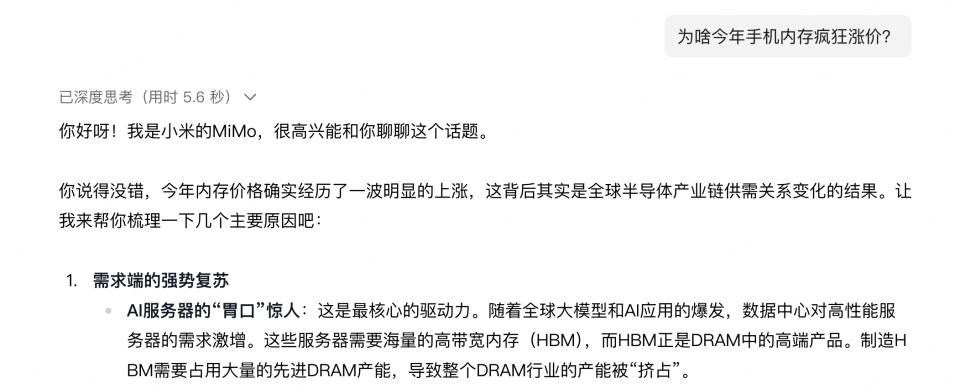MiMo 只花了 5 秒钟时间深度思考,就开始光速敲回答,而同类型的大模型思考时间,基本都得去到 10 秒往上。